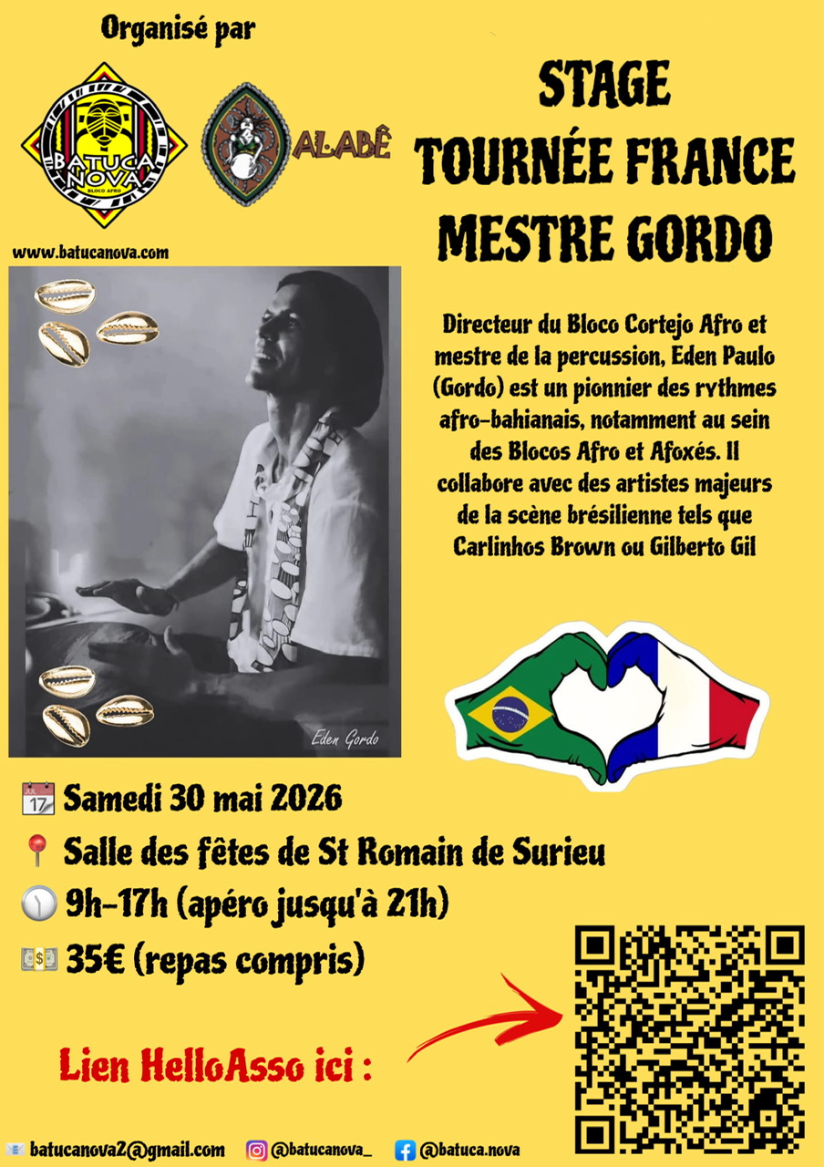 Batucanova organise un stage avec le Mestre du Cortejo Afro, Eden Paulo dit O Gordo. Celui-ci aura lieu le samedi 30 mai de 9h30 à18h00 à la salle des fêtes de St Romain de Surieu (38) Inscriptions : https://www.helloasso.com/associations/de-la-rue-a-la-scene-69/evenements/stage-o-gordo-cortejo-afro